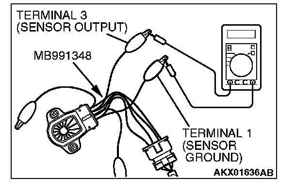 2. Connect a digital voltmeter between throttle position sensor terminal No. 3 (sensor output) and terminal No. 1 (sensor ground).
