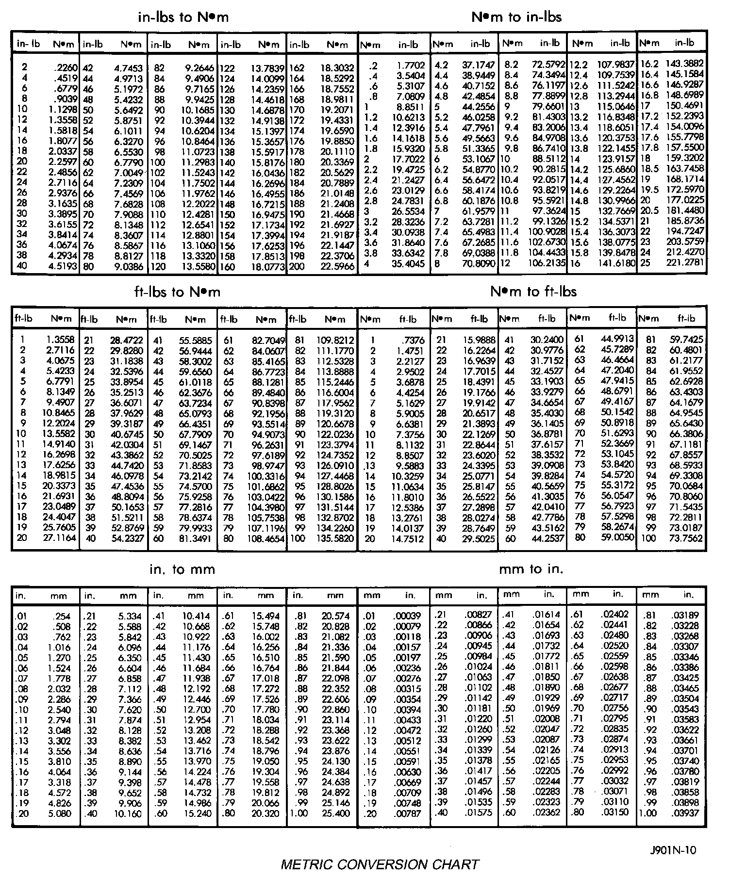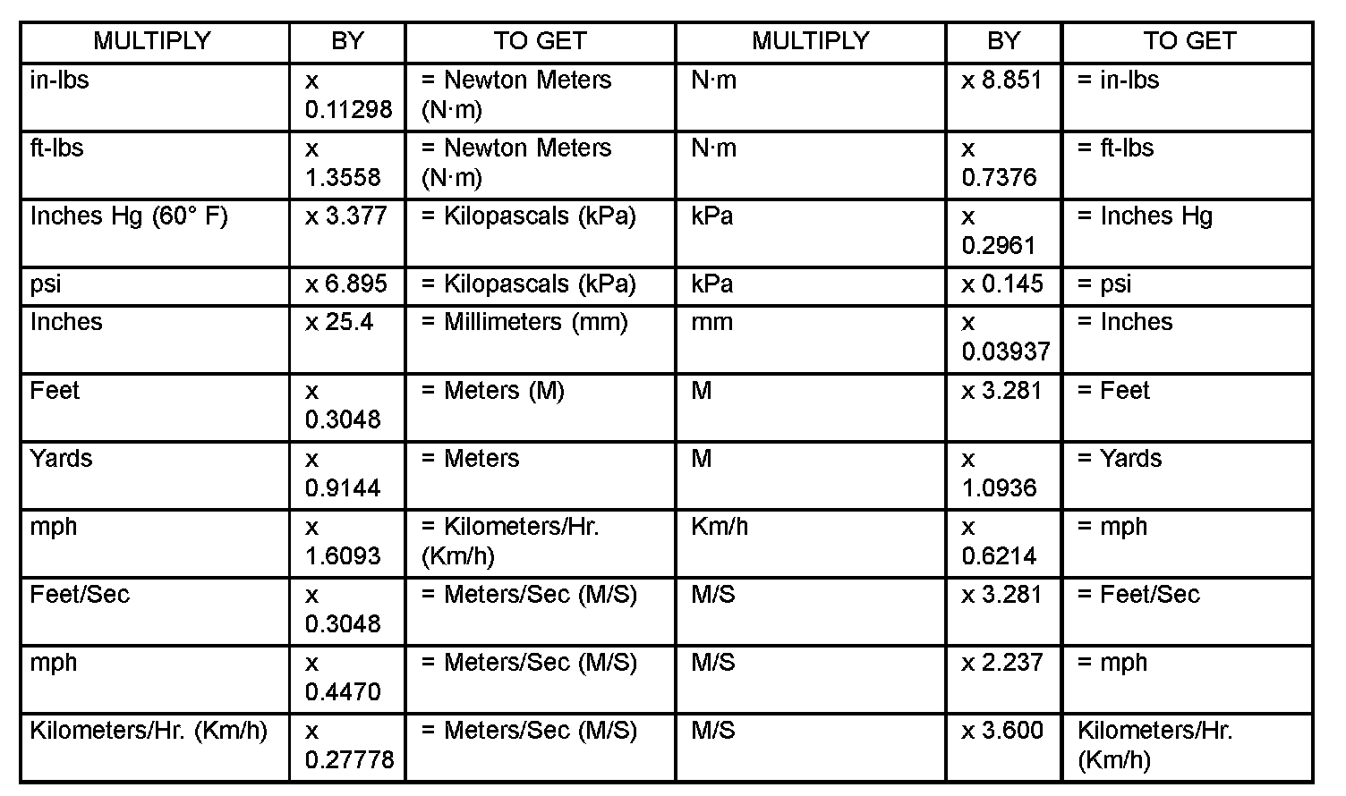 Refer to the Metric Conversion Chart to convert torque values listed in metric Newton-meters (Nm). Also, use the chart to convert between millimeters (mm) and inches (in.).