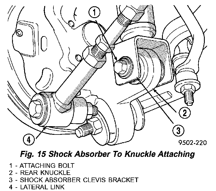 3. Remove the shock absorber clevis bracket to rear knuckle attaching bolt and nut on both sides of the vehicle (Fig.15).