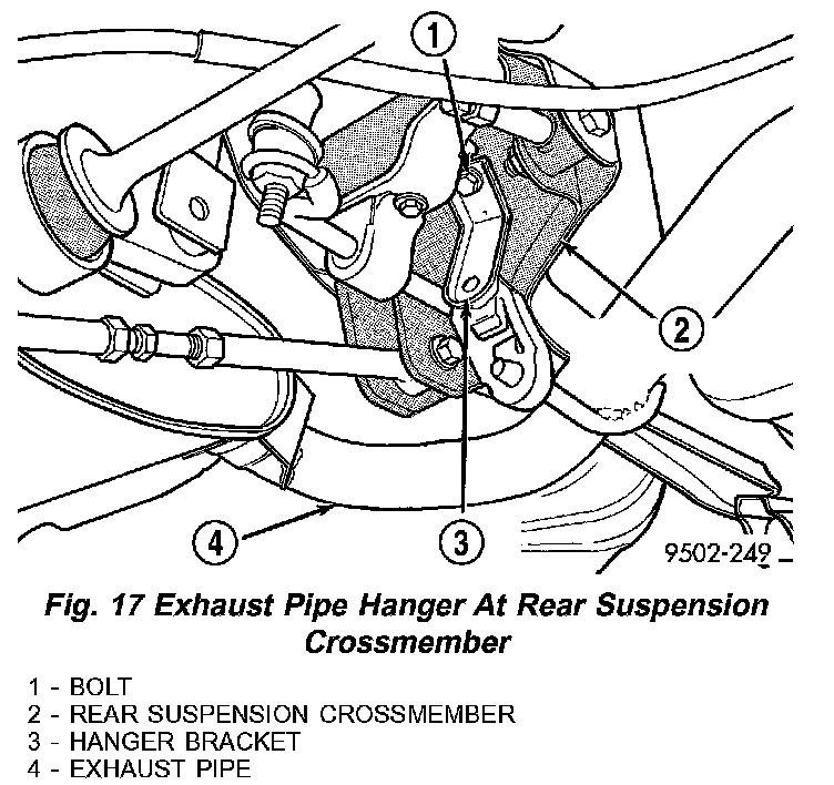 5. Remove the rear exhaust pipe hanger from the rear suspension crossmember (Fig.17). Let exhaust system drop down as far as possible.