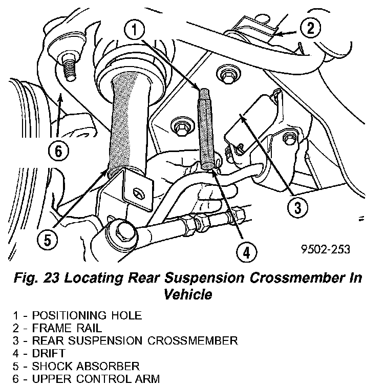 6. Position a drift of the appropriate size into the positioning hole in each side of rear suspension cross-member and locating holes in the frame rail of the body. (Fig. 23). This is required to properly position rear suspension crossmember side-to-side and front-to-rear in the body of the vehicle.