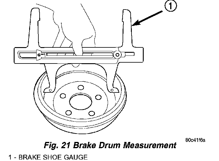 5. Using a brake shoe gauge, Special Tool C-3919 or equivalent, measure the inside diameter of the brake drum (Fig. 21). Tighten the gauge set-screw at this measurement.