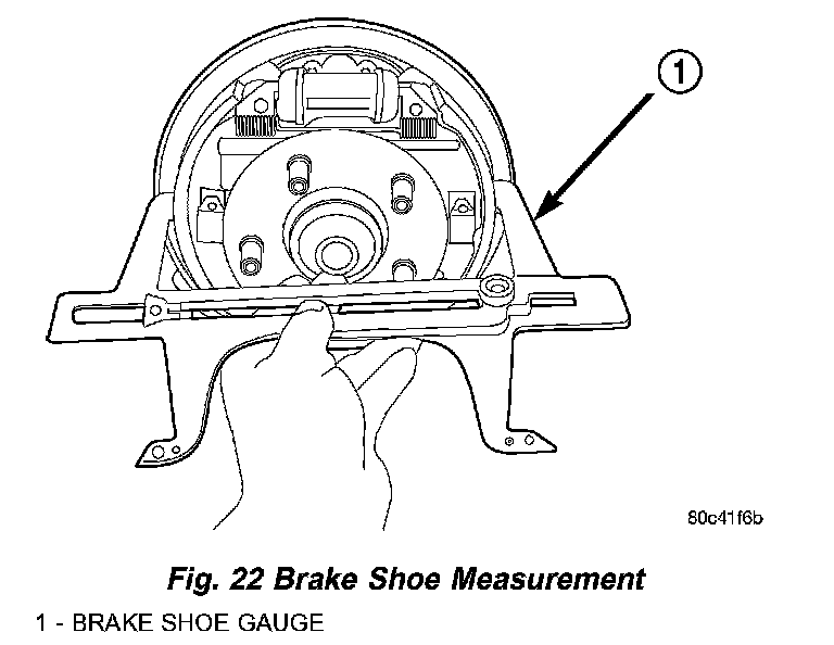6. Place the other side of the brake shoe gauge on the brake shoes as shown (Fig. 22).