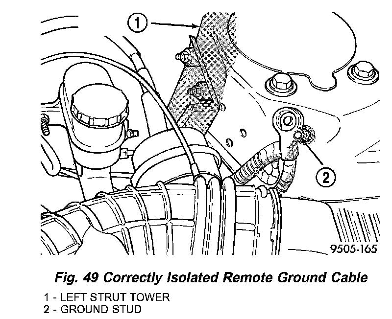 2. Correctly isolate remote ground cable by installing the ground cable insulator on the strut tower ground stud as shown (Fig. 49). This will prevent accidental grounding of the remote ground cable.