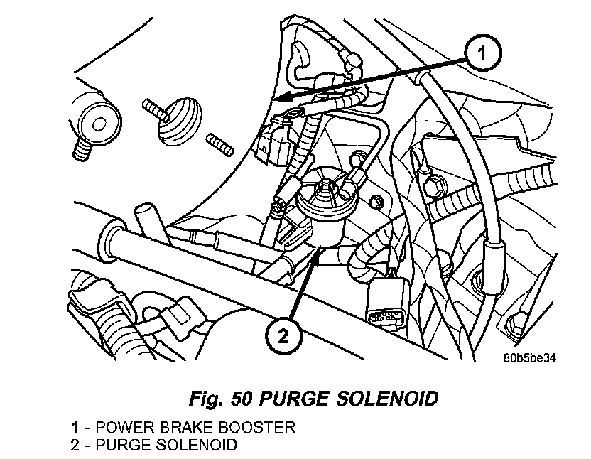 7. Remove the electrical connector and mounting screw from the purge solenoid mounted on the left frame rail (Fig. 50). Allow the solenoid to drop downward.