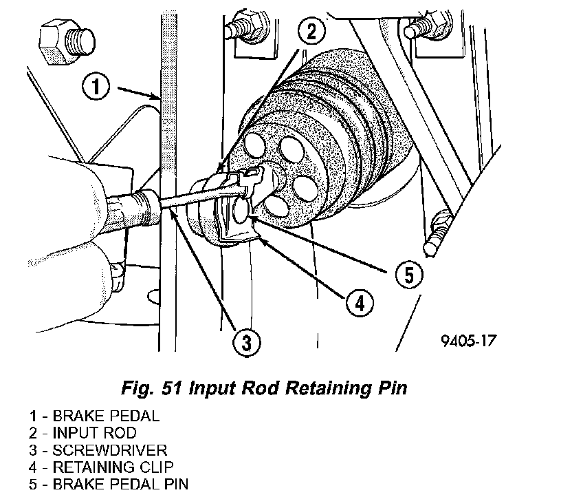 8. Locate the power brake vacuum booster input rod to brake pedal attachment under instrument panel. Position a small screwdriver between the center tang on the power brake booster input rod to brake pedal pin retaining clip (Fig. 51).