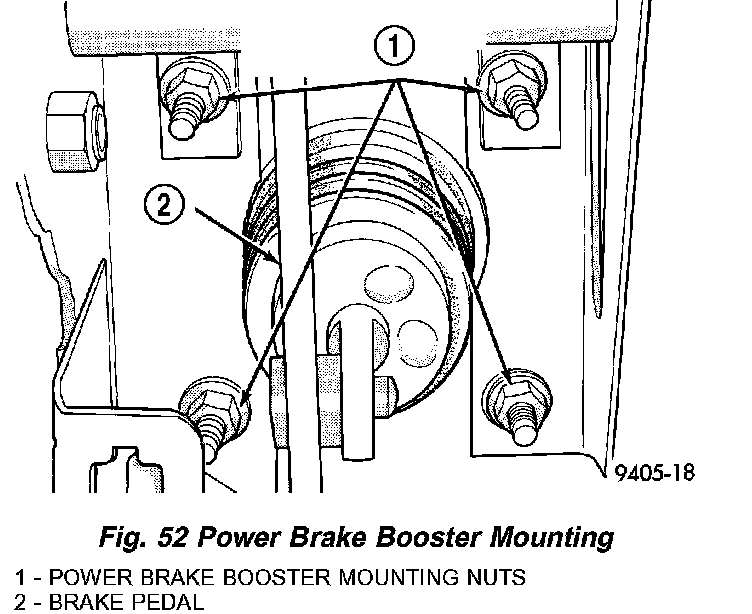 2. Install and torque the 4 power brake vacuum booster mounting nuts (Fig. 52) to 29 Nm (250 inch lbs.) torque.