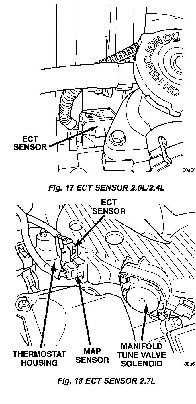 The Engine Coolant Temperature (ECT) Sensor threads into the thermostat housing just below the coolant outlet connector (Fig. 17). The ECT Sensor is a negative thermal coefficient sensor.