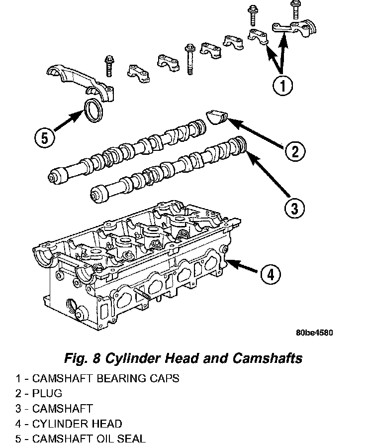 The cross flow designed, aluminum cylinder head contains dual over-head camshafts with four valves per cylinder (Fig. 8). The valves are arranged in two in-line banks. The intake valves face toward the front of the vehicle. The exhaust valves face the dash panel. The cylinder head incorporates powdered metal valve guides and seats. The cylinder head is sealed to the block using a multi-layer steel head gasket and retaining bolts. Integral oil galleries provide lubrication passages to the hydraulic lash adjusters, camshafts, and valve mechanisms.