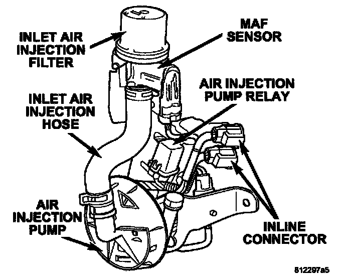 When the Air Injection Pump is activated, air is drawn into the Air Injection System through the Inlet Air Injection Filter. The air is then passed through the MAF Sensor, which monitors the amount of air that enters the Air Injection System. The PCM uses the MAF Sensor information to control Air Pump operation based on feedback from the front O2 sensor. After passing through the MAF Sensor, air travels through the Inlet Air Injection hose, into the Air Pump (where it is compressed), through the Air Injection (Nylon) Tube, past the Exhaust one-way check valve, and into the exhaust system.