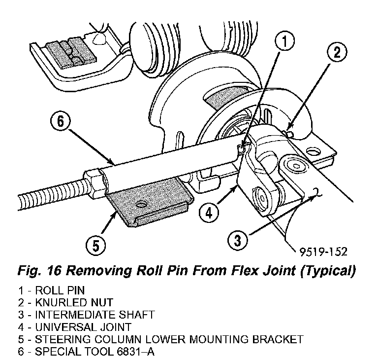 12. Install Remover/Installer, Special Tool 6831-A, through center of roll pin in intermediate shaft's universal joint and install knurled nut (Fig. 16).