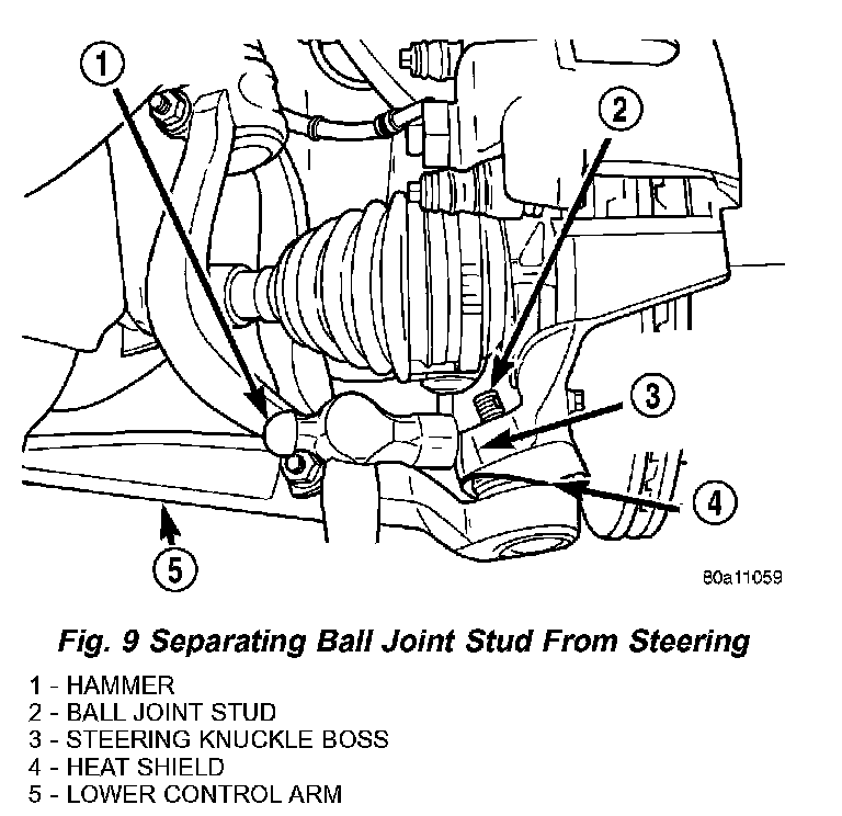 9. Turn steering knuckle so front of it is facing as far outboard in wheel well as possible. Using a hammer, strike boss on steering knuckle (Fig. 9) until steering knuckle separates from lower ball joint stud.