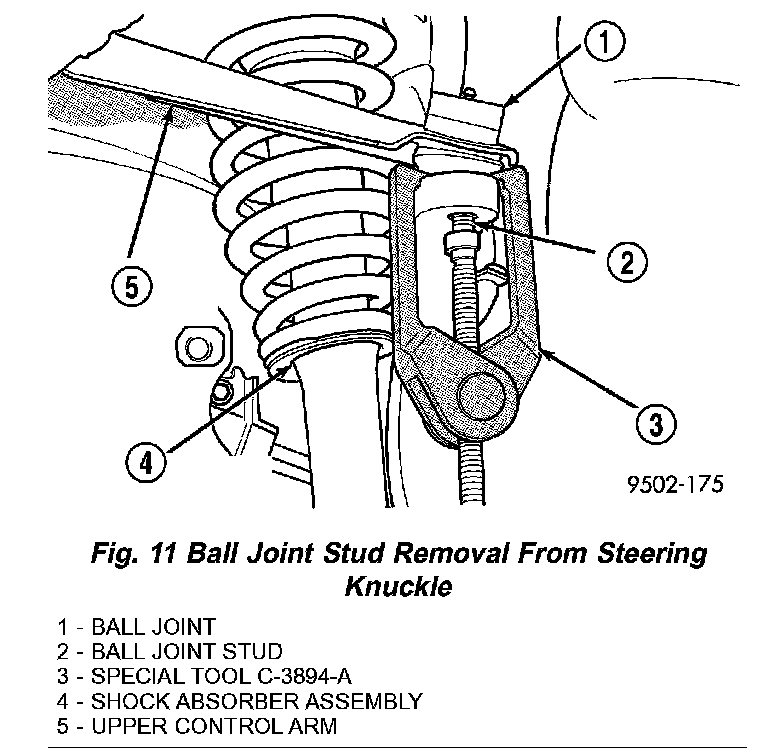 13. Remove upper ball joint stud from steering knuckle using Puller, Special Tool, C-3894-A (Fig. 11).