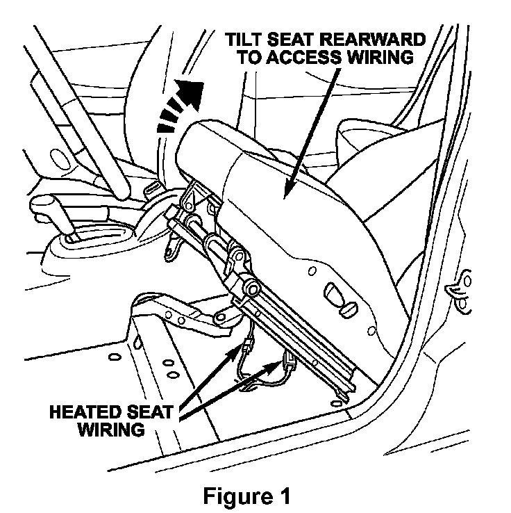 4. Tilt the seat assembly rearward to gain access to the heated seat wiring located under the seat and disconnect the wiring (Figure 1).