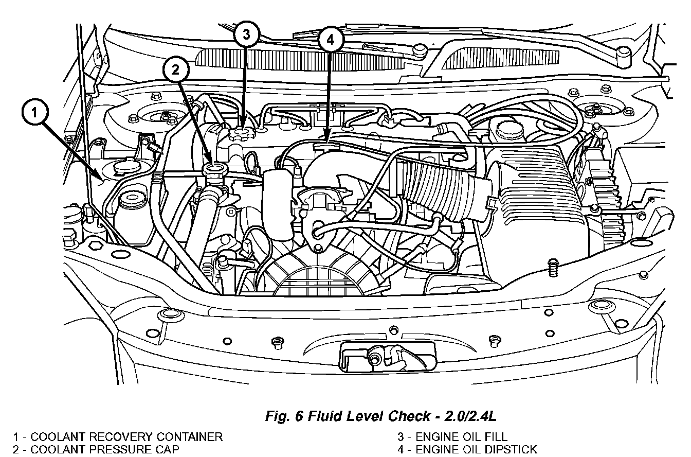 The coolant bottle provides a quick visual method for determining the coolant level without removing the pressure cap. With the engine cold and not running, simply observe the level of the coolant in the coolant recovery container (2.0L/2.4L) (Fig. 6) or the coolant pressure container (2.7L) (Fig. 7). The level should be between the MIN and MAX marks.