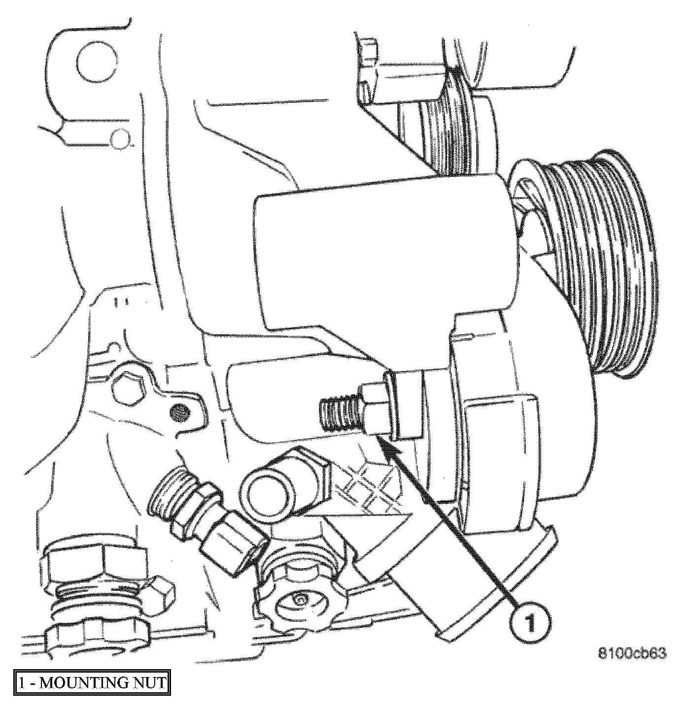 1. If belt tensioner was removed, install tensioner and mounting nut. Torque mounting nut to 41 N-m (30 ft. lbs.).