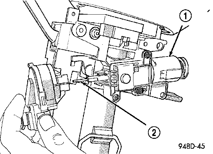 2. Place key cylinder in RUN position. Through the hole in the lower shroud (2), depress lock cylinder retaining tab and remove key cylinder.