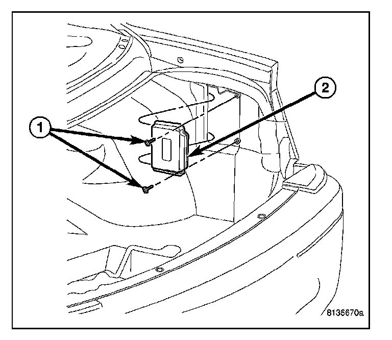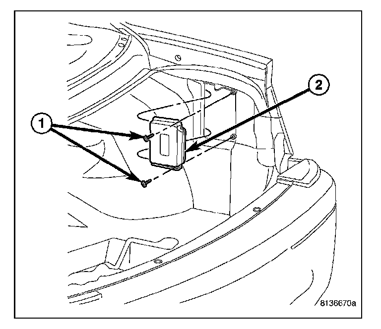 2. Position the Park Assist Module (2) and install the two attaching screws (1). Torque screws to 3.5 N.m (30 in.lbs.).