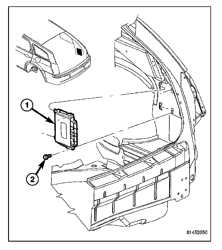 4. Remove the two attaching screws (1) and separate the module (2) from the vehicle.
