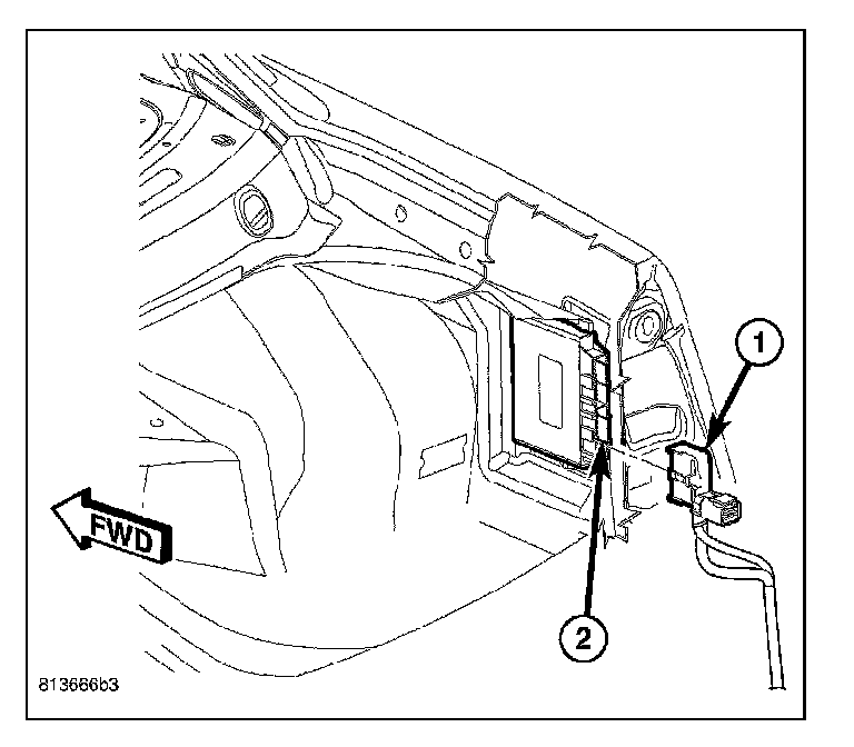 2. Peel back the right inner trunk carpet to expose the Park Assist Module (2).