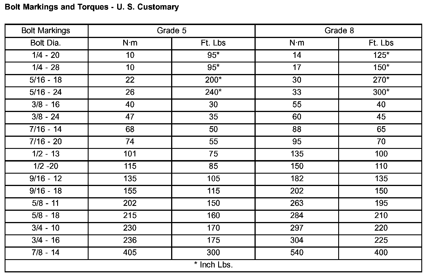 Bolt Markings And Torques - U. S. Customary: