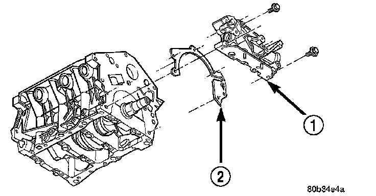 6. Remove the oil pump fasteners. Remove the oil pump (1) and gasket (2) from engine.