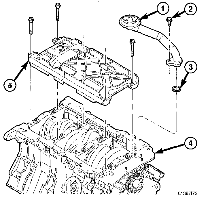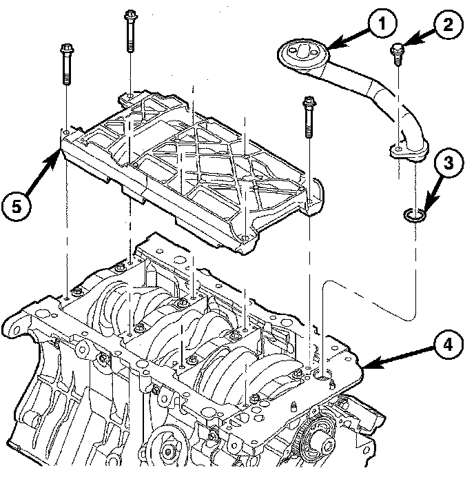 2. Install oil pump (4) and gasket (3) carefully over the crankshaft. Position pump onto block and tighten bolts to 28 Nm (250 inch lbs.).