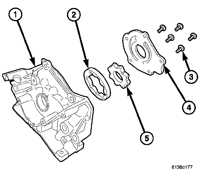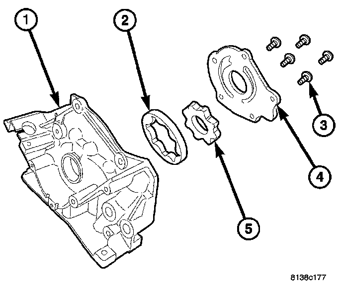 1. Remove oil pump cover screws (3) and lift off cover (4).