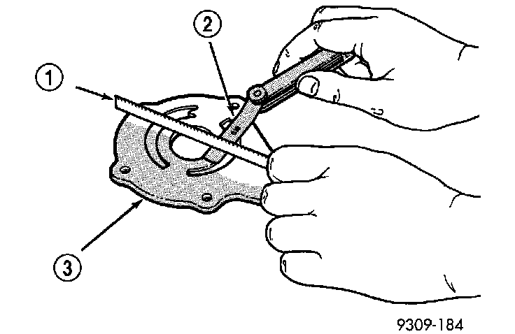 3. Lay a straightedge (1) across the pump cover (3) surface. If a 0.025 mm (0.001 inch) feeler gauge can be inserted between cover and straight edge, cover should be replaced.