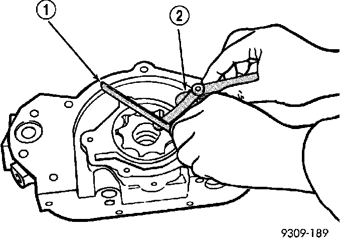 6. Slide outer rotor (2) into body, press to one side with fingers and measure clearance between rotor and body. If measurement is 0.39 mm (0.015 inch.) or more, replace body only if outer rotor is in specifications.