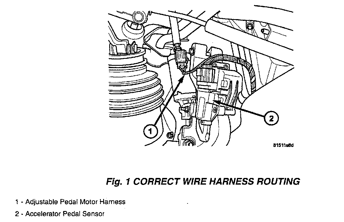 3. Inspect the wiring harness at the adjustable pedal motor to ensure it is routed over the top of the accelerator pedal sensor (Fig. 2) (Fig. 1). If necessary disconnect and route the adjustable pedal motor harness over the top of the accelerator pedal sensor. Reconnect the connector and continue to the appropriate flash procedure.
