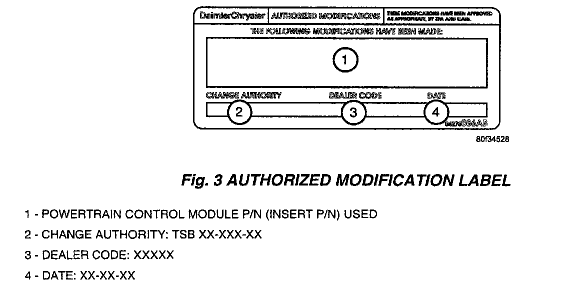 14. Type the necessary information on the "Authorized Modification Label" p/n 04275086AB and attach near the VECI label (Fig. 3).