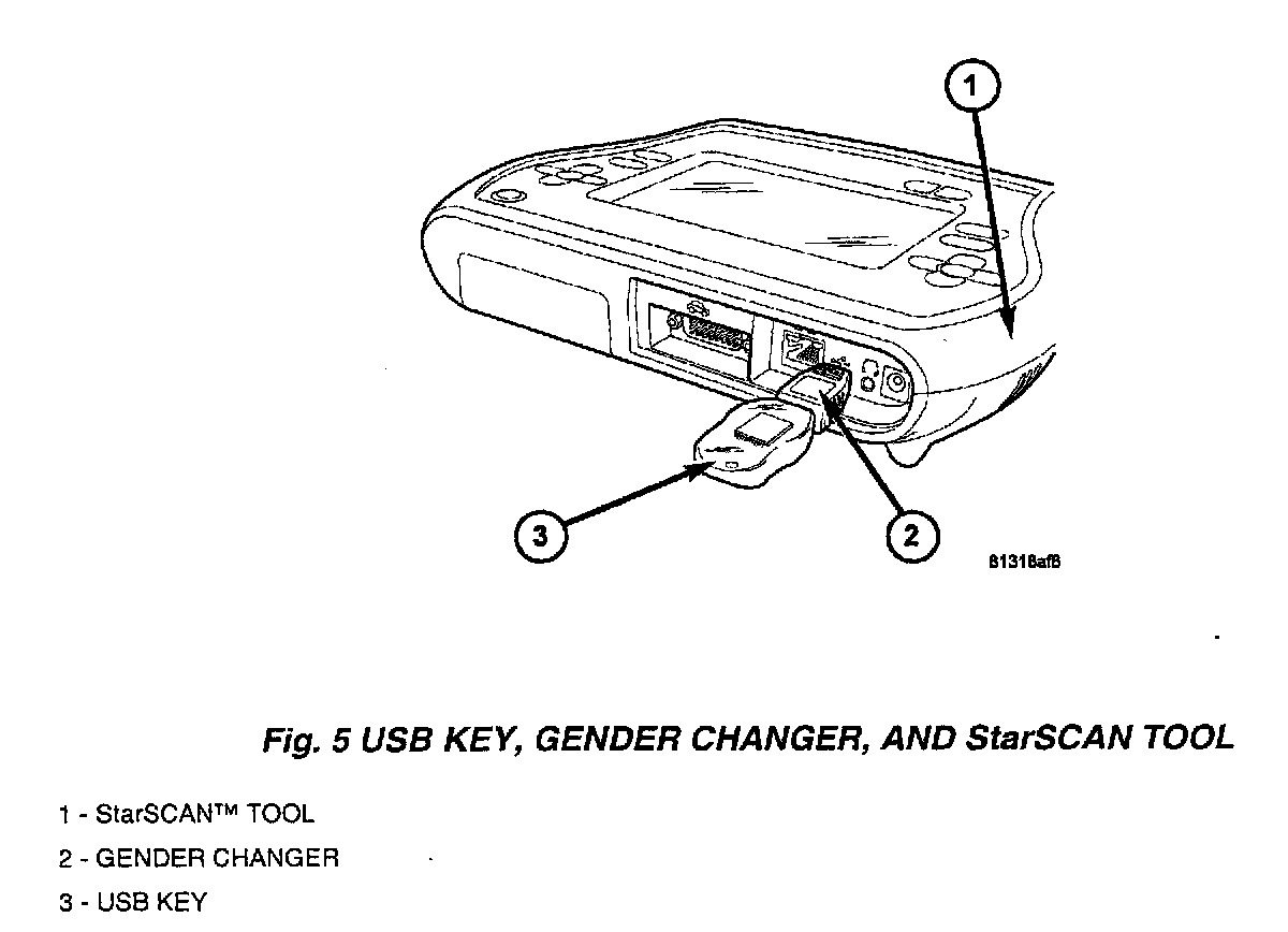 8. With the StarSCAN powered OFF, connect the USB Key and Gender Changer to the StarSCAN USB port (Fig. 5).