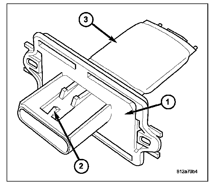 The blower motor resistor is mounted to the rear of the HVAC housing, directly behind the glove box. The blower motor resistor consists of a molded plastic mounting plate (1) with an integral wire connector receptacle (2). Concealed behind the mounting plate are coiled resistor wires contained within a ceramic heat sink (3).