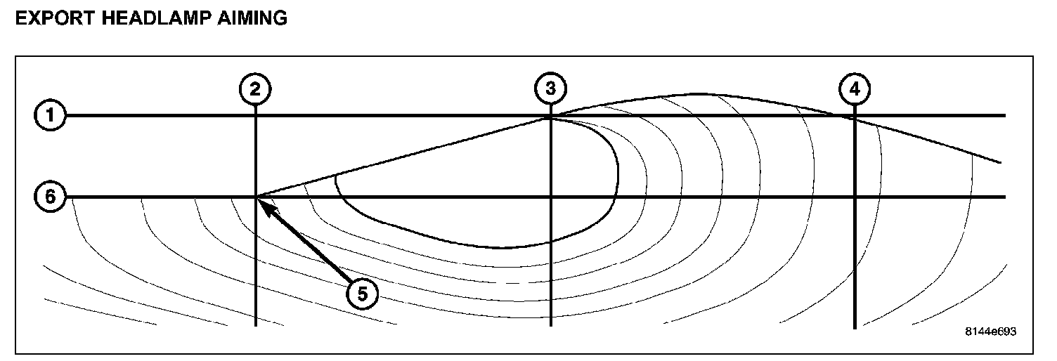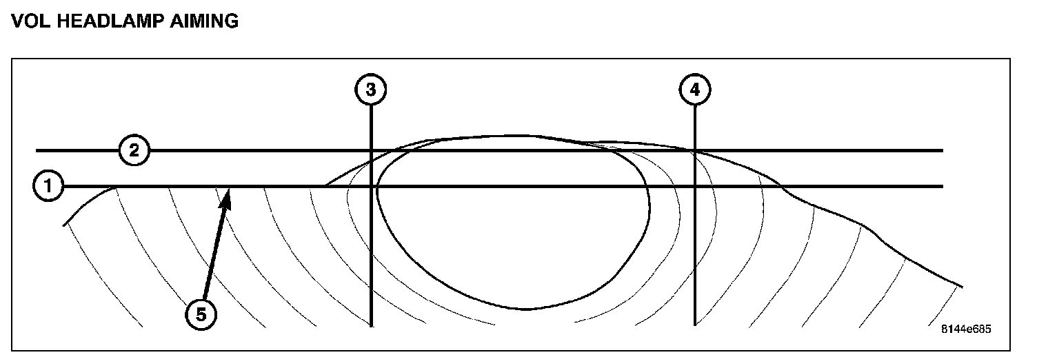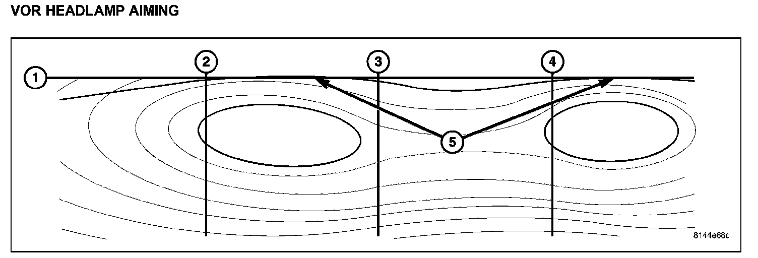 With the horizontal centerline of the headlamp (1) transferred on the wall, this line (1) will be the vertical aiming mark. Using the right side of the headlamp vertical centerline (2 for the left and 4 for the right), adjust the headlamp unit so the residual light from the headlamp is even with the horizontal centerline (1). The ideal alignment should be (5).