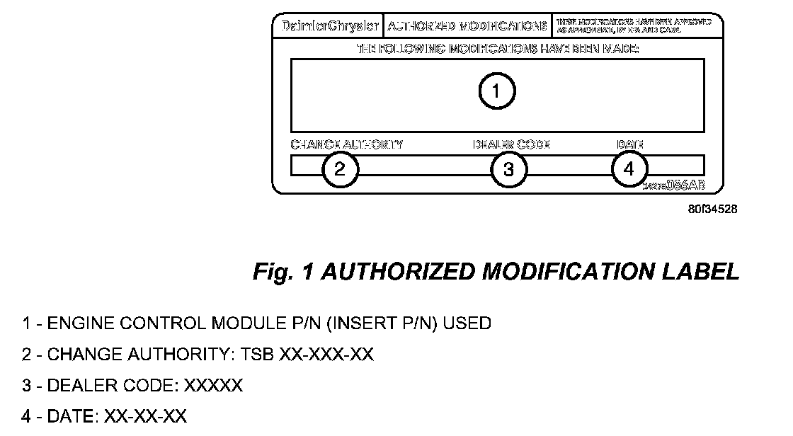 10. Type the necessary information on the "Authorized Modification Label p/n 04275086AB and attach near the VECI label (Fig. 1).