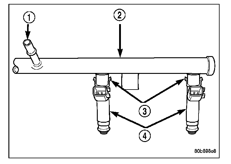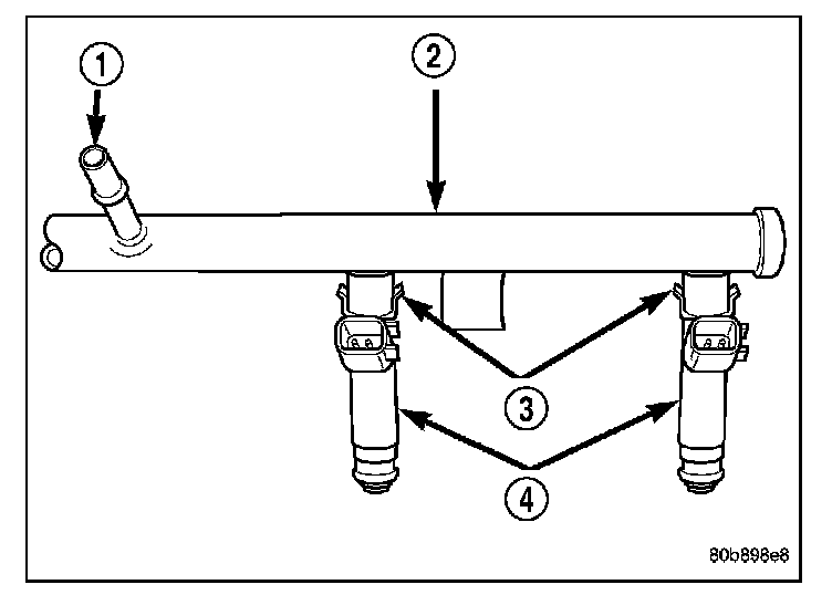 2. Install injector(s) (4) and injector clip(s) (3) to fuel rail.