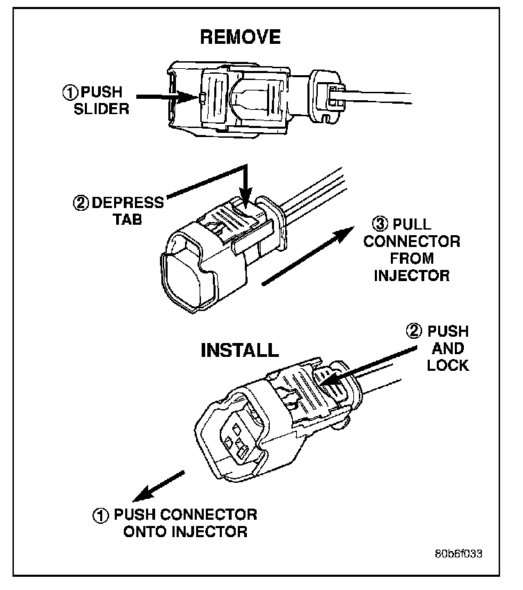 10. Disconnect electrical connectors at all 8 fuel injectors. Refer to graphic. Push red colored slider away from injector (1). While pushing slider, depress tab (2) and remove connector (3) from injector. The factory fuel injection wiring harness is numerically tagged (INJ 1, INJ 2, etc.) for injector position identification. If harness is not tagged, note wiring location before removal.