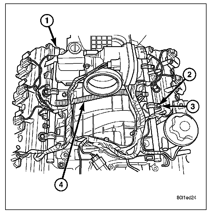 7. Remove spark plug cable tray from engine by releasing 4 retaining clips (2). Remove tray and cables from engine as an assembly.