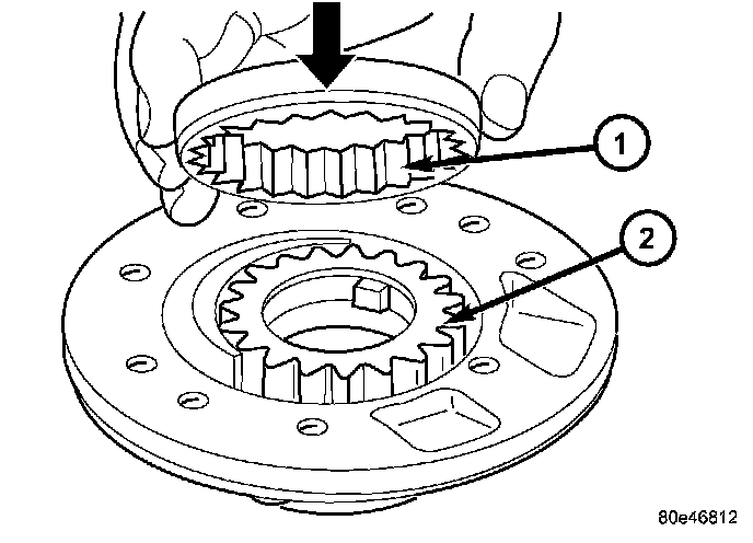 3. Lubricate pump gears and place in the pump housing. Insert pump gear (1) so that the chamfer (arrow) points towards the pump housing.