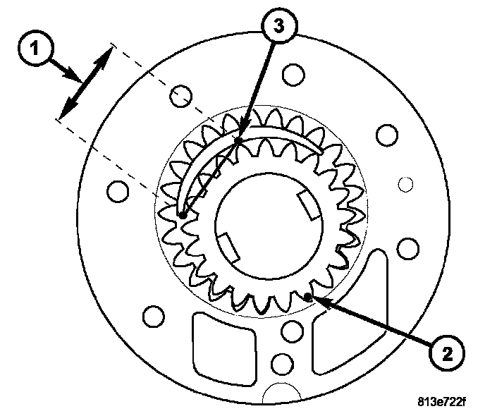 Tip clearance for the inner gear can be checked by moving the inner gear into tight mesh (2) with the outer gear as shown. Clearance between the ID of the crescent feature of the housing and the OD of the teeth of the inner gear (3) should then me measured at a point 37 mm from the corner of the crescent (1) feature, as shown below.