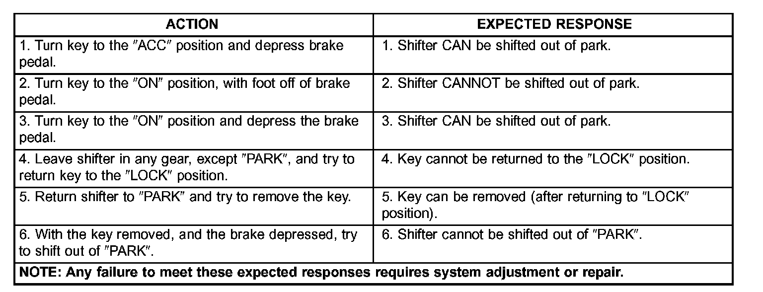 The above chart describes the normal operation of the Brake Transmission Shift Interlock (BTSI) system. If the "expected response" differs from the vehicle's response, then system repair and/or adjustment is necessary.