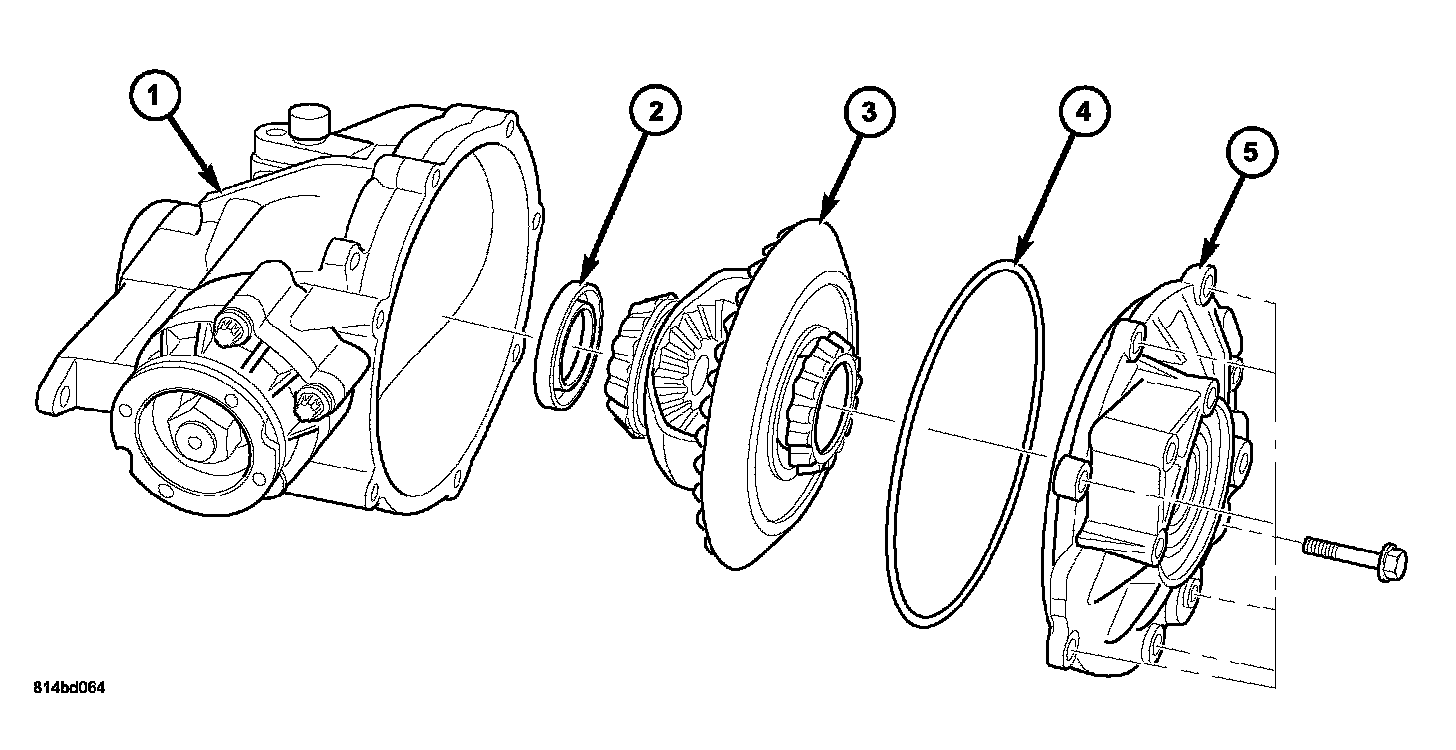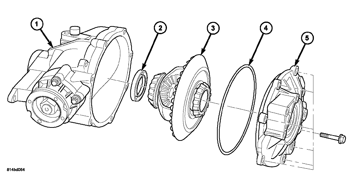 15. Install differential/ring gear assembly (3), new cover O-ring seal (4), and cover (5).