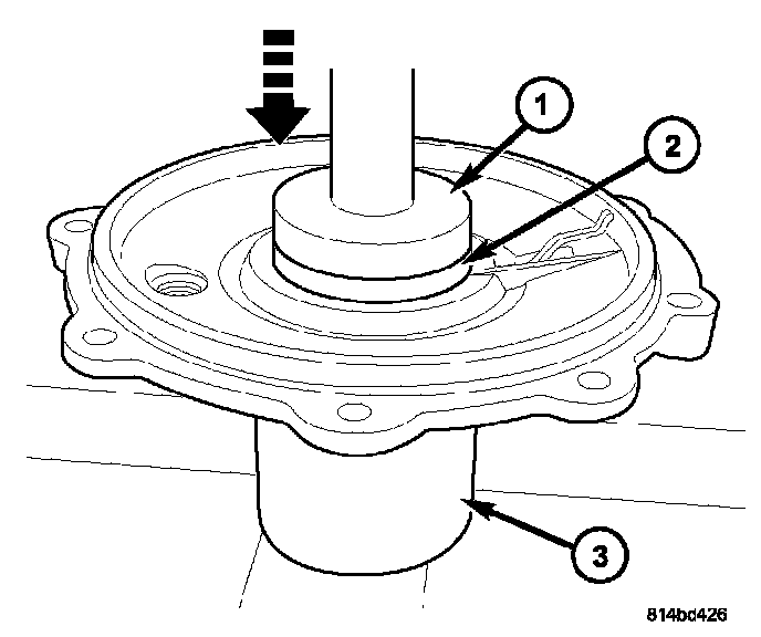 10. Using Tools C-4171 and D-129 (1), press new side bearing cup into cover until it bottoms. Use suitable cup (3) to support and protect cover.