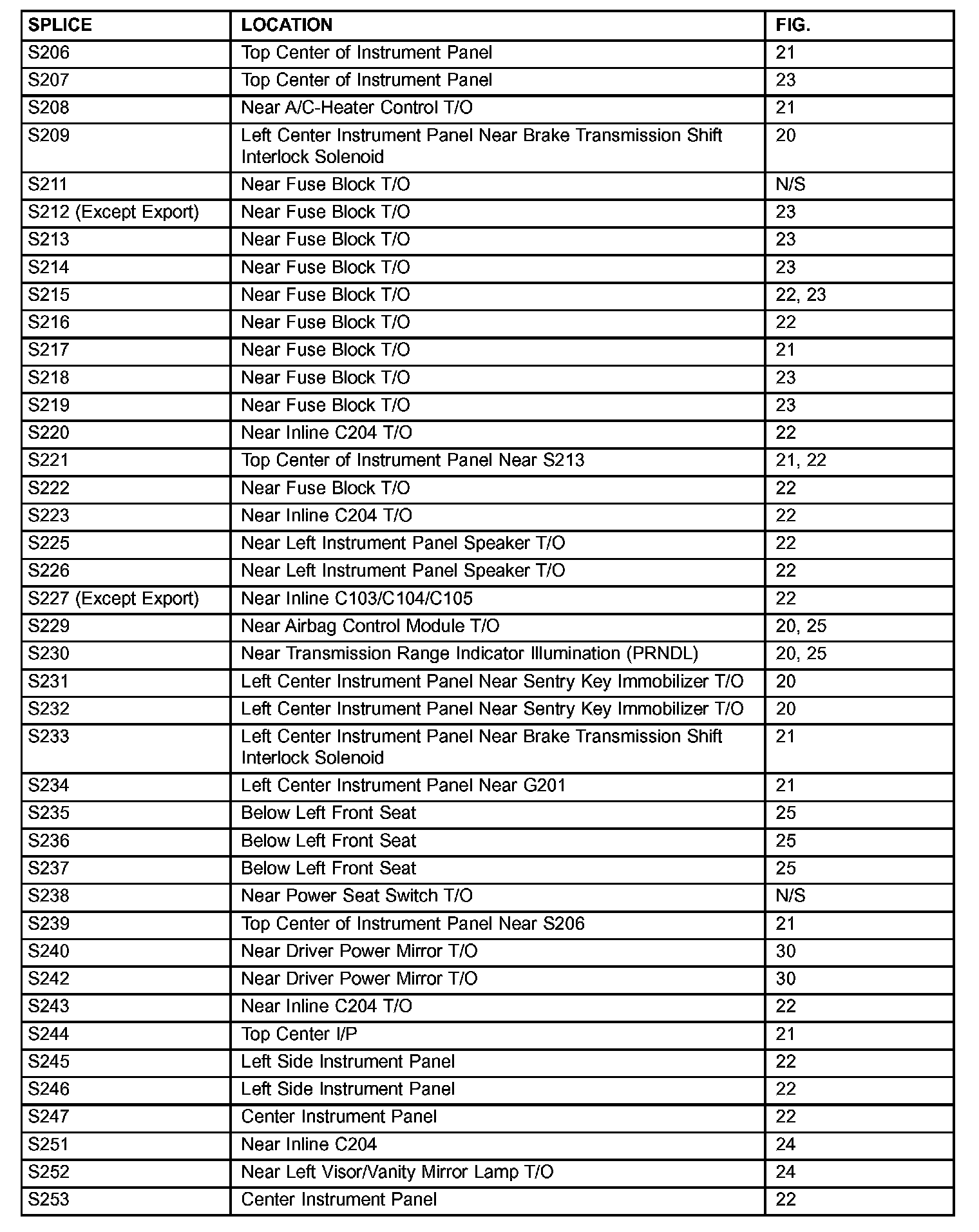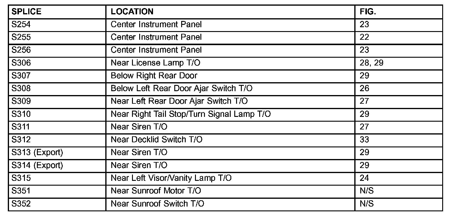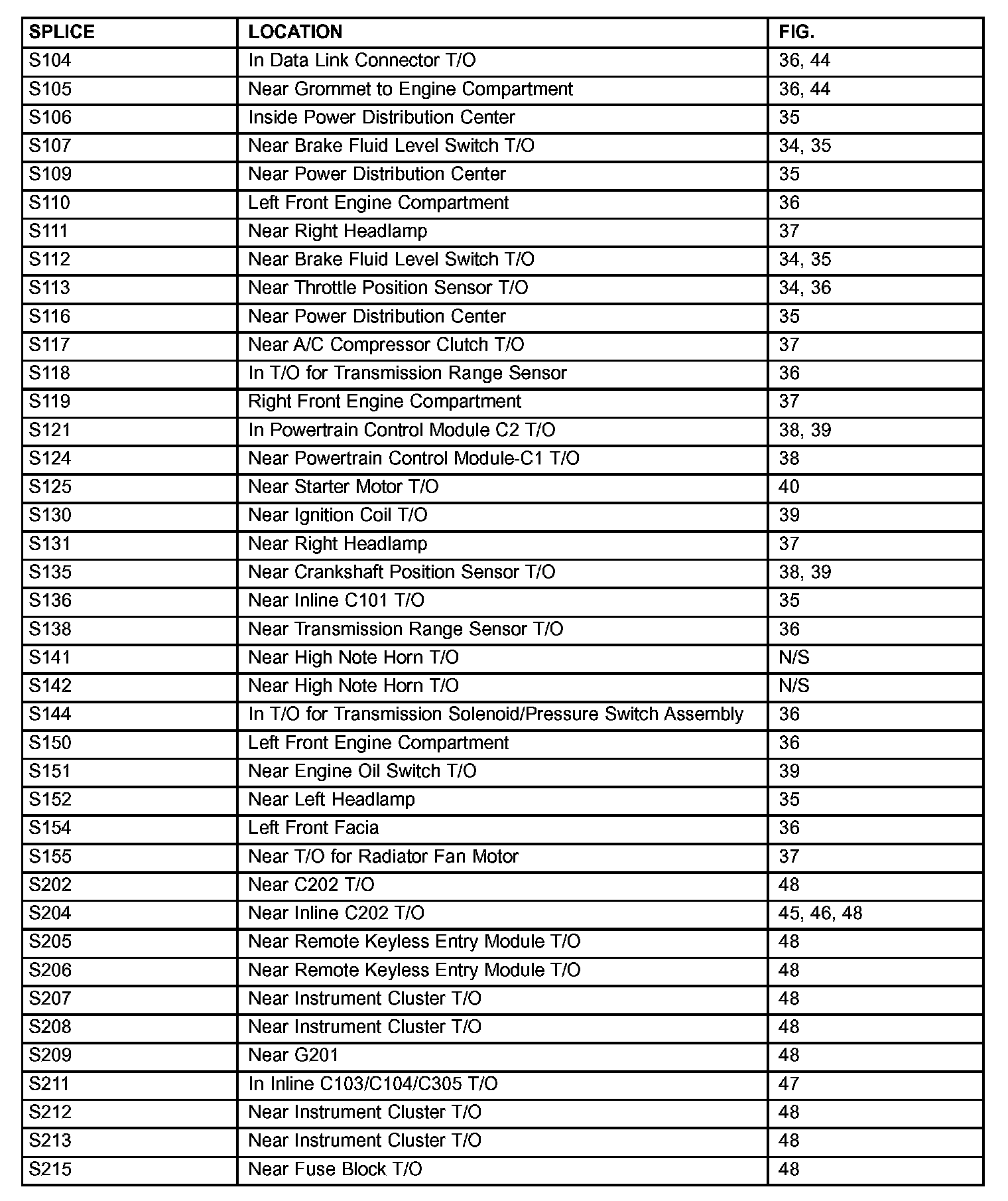 The abbreviation T/O (Take Out) is used in the location column to indicate a point in which the wiring harness branches out to a component.