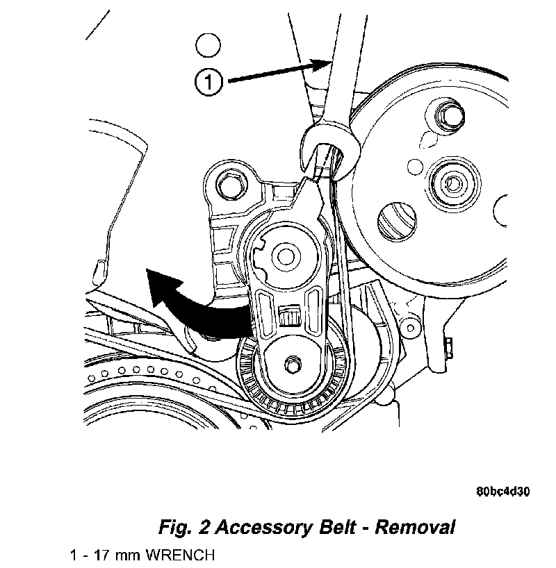 2. Using a 17 mm wrench, rotate belt tensioner clockwise (Fig. 2) until belt can be installed on the power steering pulley. Release spring tension onto belt.