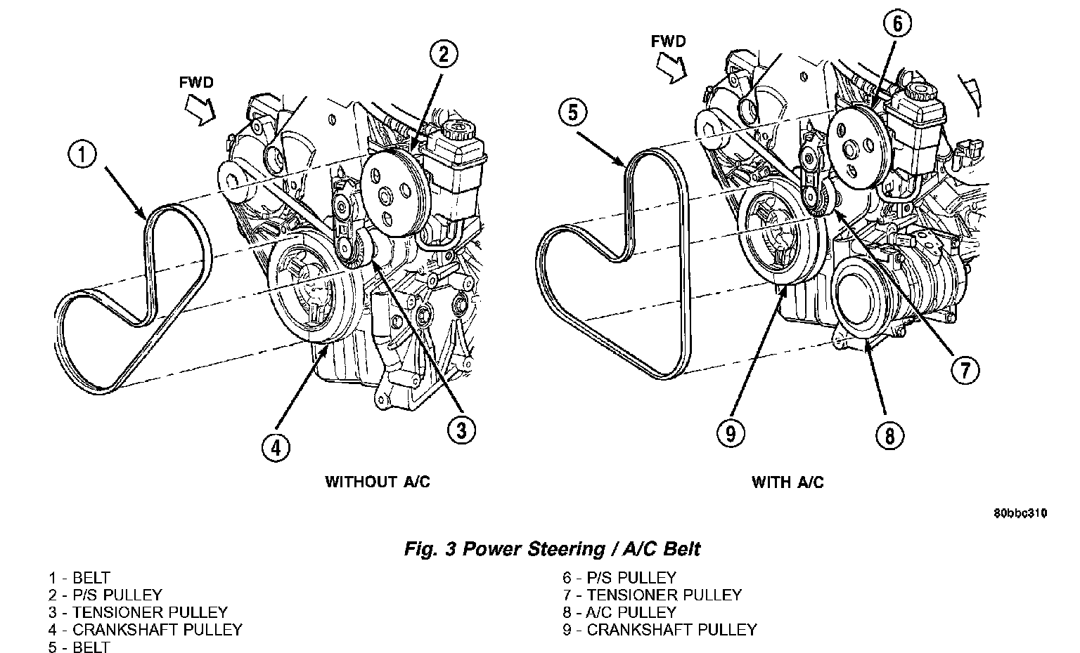 1. Install the drive belt (Fig. 3) over all the pulleys except for the power steering pump pulley.