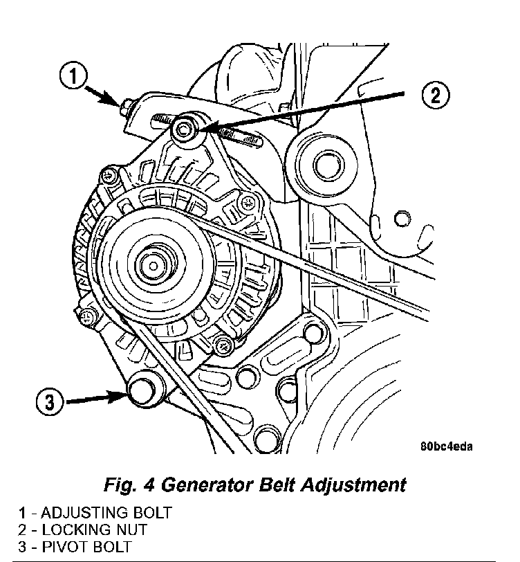 6. Loosen generator adjusting bolt until generator belt can be removed (Fig. 4).