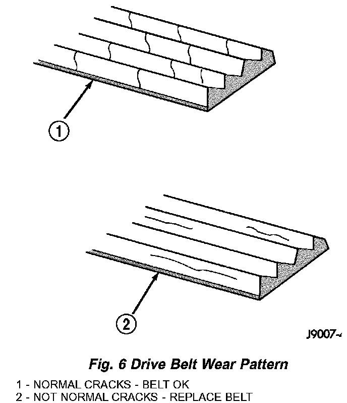 Pully-V Belt system may develop minor cracks across the ribbed side (due to reverse bending). These minor cracks are considered normal and acceptable. Parallel cracks are not (Fig. 6).