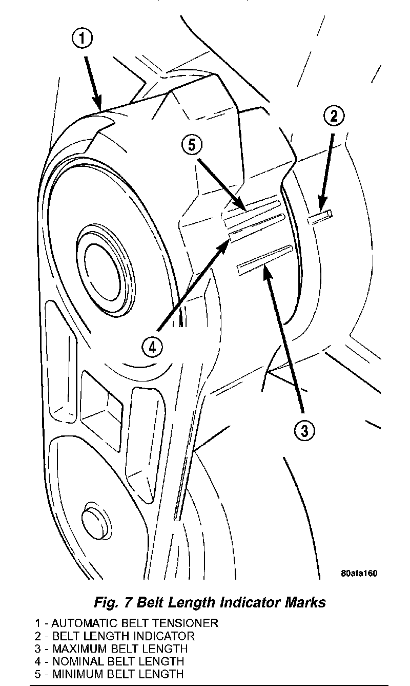 3. After belt is installed, inspect belt length indicator marks (Fig. 7). The indicator mark should be within the minimum belt length and maximum belt length marks. On a new belt, the indicator mark should align approximately with the nominal belt length mark.